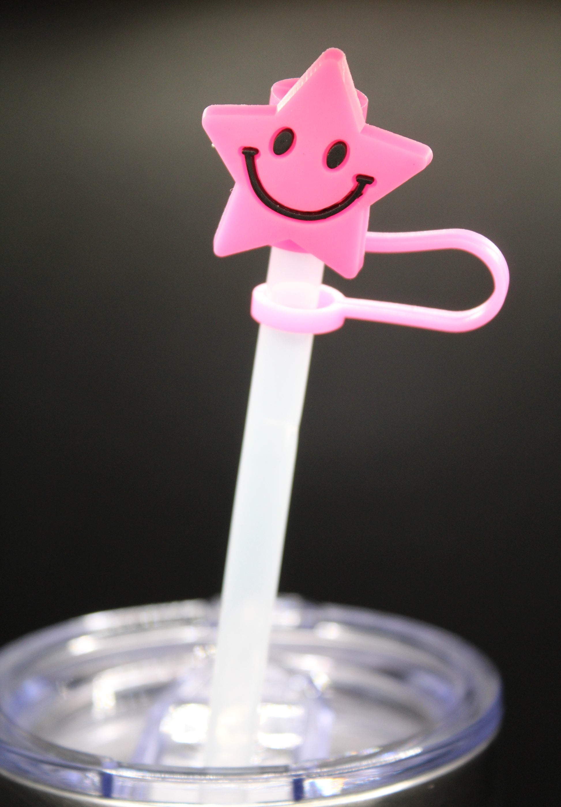 Pink Smile Star Straw Cap - Fits best on regular plastic straws but can go on thin metal straws!